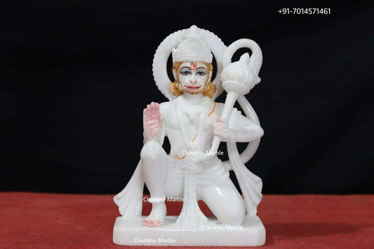 Hanuman Ji Marble Statue By Chookho Marble Hanuman Ji Marble Statue is made in one single piece of premium marble. He is sitting in a mudra called ashirwad mudra and other hand is holding Gada (mace), wearing a simple dhoti with his muscular and broad chest which is covered in...