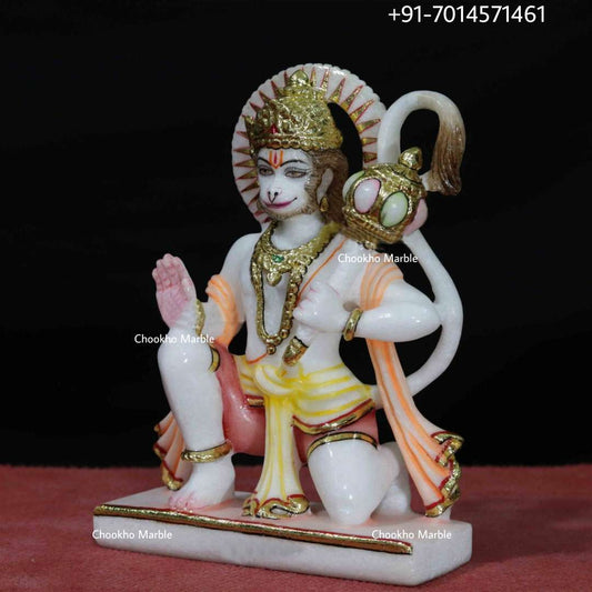 Marble Hanuman Statue By Chookho Marble Marble Hanuman Statue is made in one single piece of premium marble. He is sitting in a mudra called ashirwad mudra and other hand is holding Gada (mace), wearing a simple dhoti with his muscular and broad chest which is covered in a bevy...