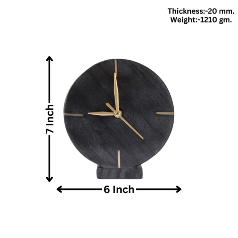 Infuse your workspace or living area with the bold, sophisticated aesthetic of the Brass Black marble table clock. Expertly handcrafted from solid natural black stone, this timepiece serves as a striking functional centerpiece that balances raw organic textures with refined metallic accents. The deep charcoal face is highlighted by hand-inlaid brass markers at the primary hours, offering a high-contrast, luxury look that commands attention on any desk, mantel, or shelf.
