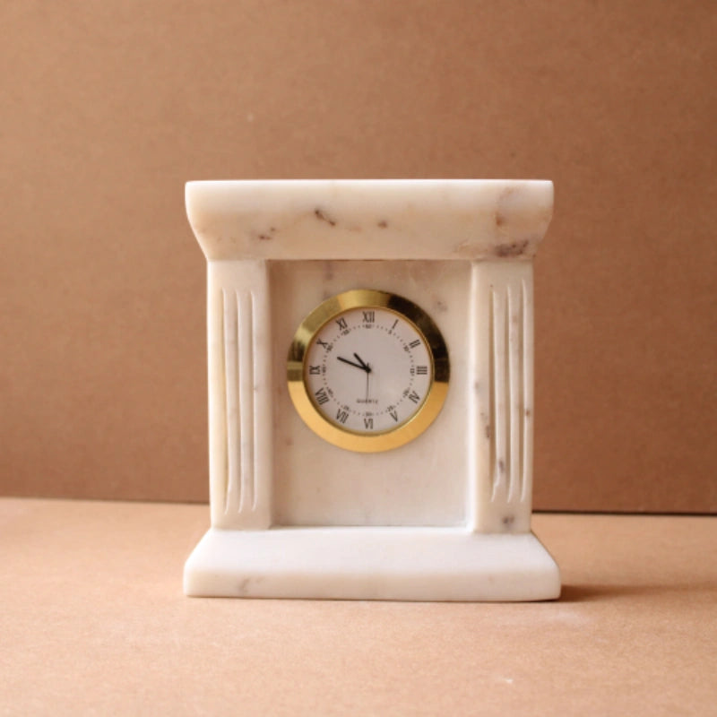 Infuse your home or executive workspace with the timeless elegance of the Italian Architecture White marble table clock. Hand-carved from a solid block of premium natural white marble, this piece features an architectural silhouette inspired by classical columns and pediments. The luminous white stone is characterized by its subtle, unique mineral veining, ensuring that every clock is a one-of-a-kind functional sculpture that anchors any room with a sense of history and sophistication.