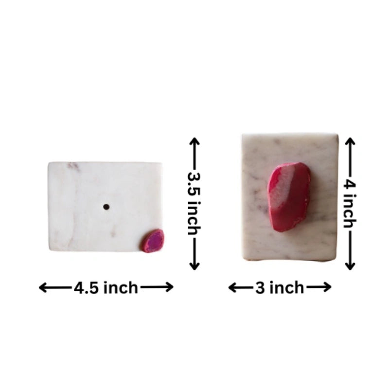 Every component of this four-piece set is carved with clean, rectangular silhouettes that emphasize the substantial, weighted quality of natural stone. The polished white marble serves as a pristine canvas for the vibrant pink accents, ensuring no two sets are exactly alike due to the one-of-a-kind mineral patterns in both the marble and the agate slices. Naturally durable and cool to the touch, this collection offers a permanent luxury upgrade over standard bathroom accessories.